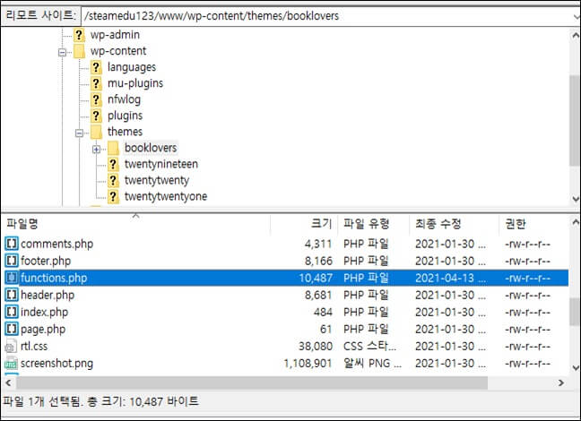만약 테마 편집기가 나타나지 않는다면 FTP를 이용해 직접 서버에 접속해서 functions.php 파일을 찾을 수 있습니다.