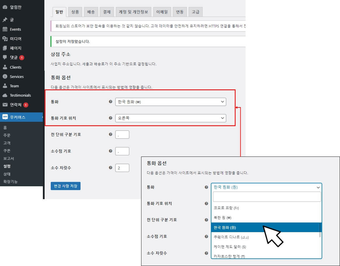 우커머스>설정>일반 에서 설정한 통화가 바뀌었는지 확인합니다.