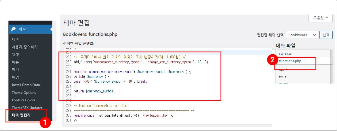 한국원화(₩)는 표시됩니다. (원) 으로 변경하기 위해서는 functions.php에 코드를 추가해야 합니다.