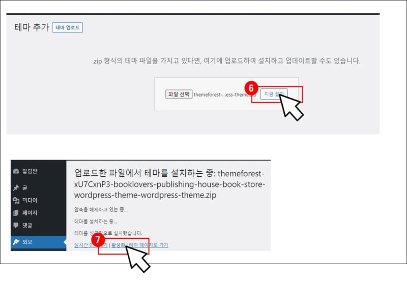 (6) 테마 압축 파일이 선택되었다면 [지금 설치] 버튼을 클릭합니다. 압축을 해제하고, 테마를 설치하는 동작을 실행합니다. "테마를 성공적으로 설치했습니다."라는 문구를 확인할 수 있습니다.
