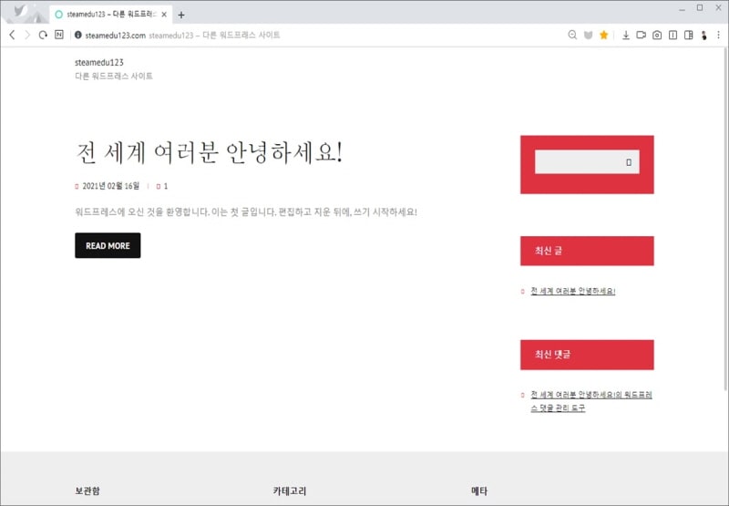 테마가 활성화된 상태에서, http://www.steamedu123.com 사이트를 접속합니다. 그런데 페이지가 이상합니다. 테마의 설명과 다르게 나옵니다.
