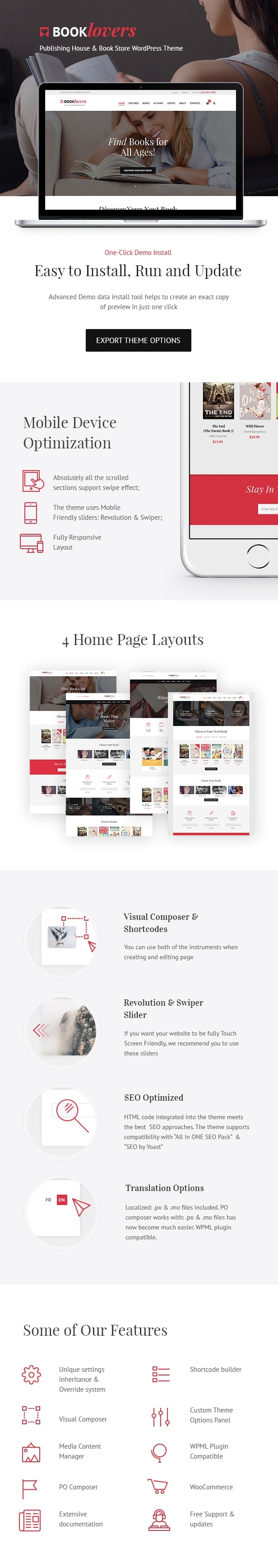 Booklovers 테마는 출판사와 같은 디자인을 제공하는 테마입니다. 만들고자 하는 홈페이지는 전자책과 같은 책 디자인을 가진 홈페이지입니다. 쇼핑몰(WooCommerce) 기능을 제공하지만 사용하지는 않을 예정입니다. 사용되는 플러그인은 WooCommerce , Revolution Slider, Essential Grid, WPBakery Page Builder 및 PO Composer 등을 사용합니다. 직관적인 인터페이스를 통한 레이아웃을 제공합니다.