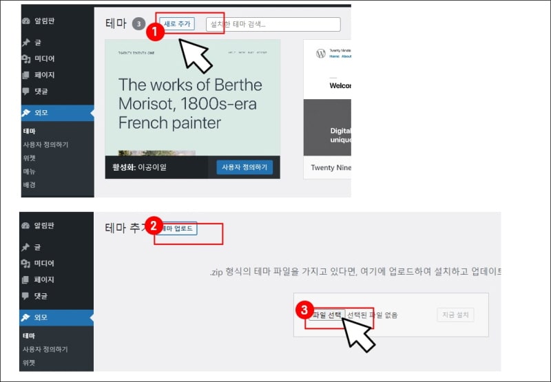 테마를 구입했다면 워드프레스에서 설치합니다.