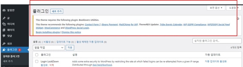 플러그인을 확인해보면 다음과 같이 테마에 필요한 프로그인을 설치해야 합니다.