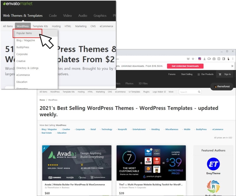 [themeforest > WordPress > Popular items]를 선택하면 가장 인기 있는 테마를 볼 수 있습니다.