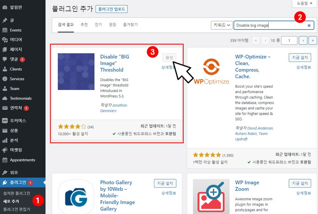플러그인>새로 추가> 키워드를 선택합니다. "Disable big image"를 입력하고 플러그인 검색을 합니다.
