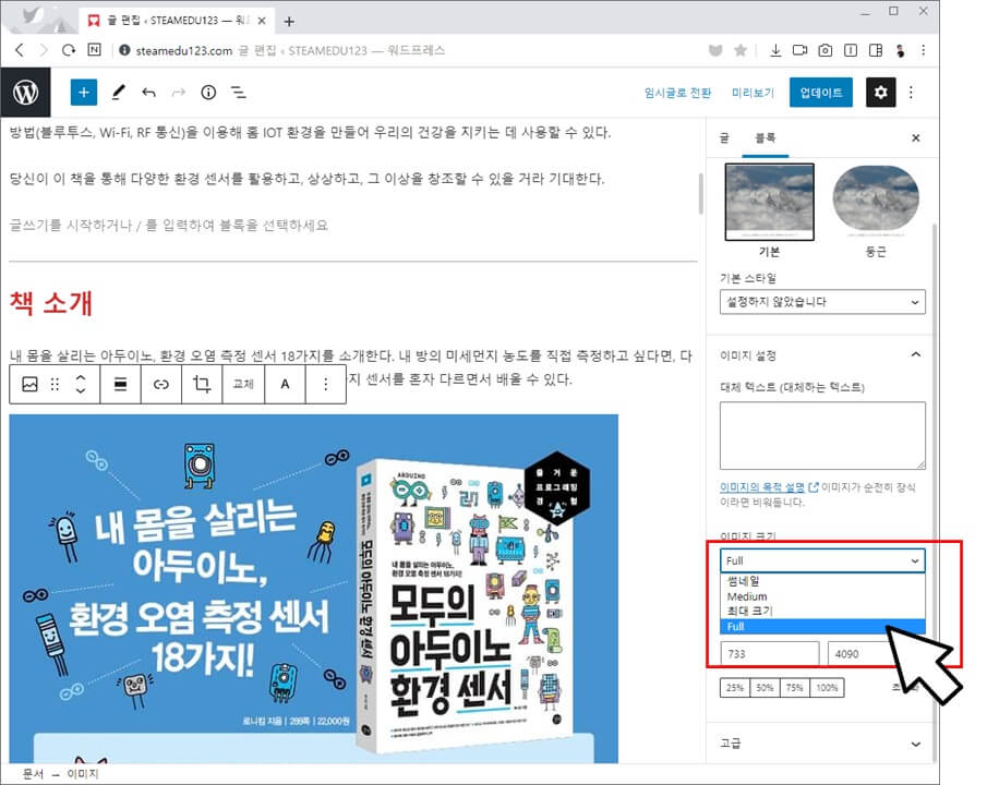 이미지를 업로드하고, 이미지 크기> FULL을 선택합니다. 원하는 원본 크기 733X4090의 이미지가 설정되는 것을 확인할 수 있습니다.