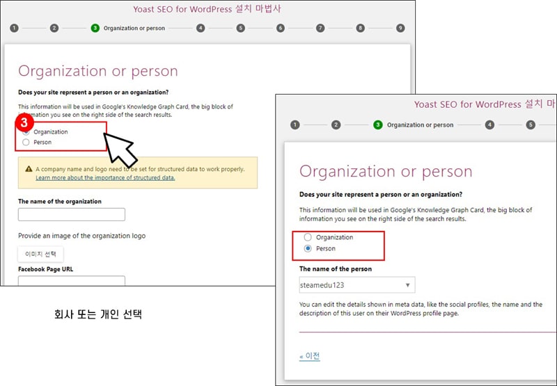 3단계 Organization or Person 은 기업 또는 개인을 선택합니다. 기업을 선택하게 되면 회사 로고 이미지를 업로드 할 수 있습니다. 개인을 선택하면 이름을 입력할 수 있습니다.