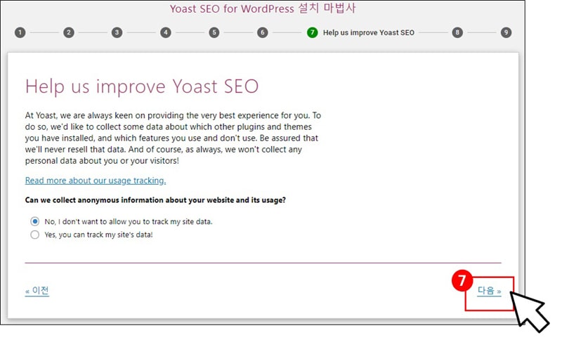 7단계 Help us improve Yoast SEO는 Yoast SEO 에 수집정보를 보내며 기본 설정 "NO"를 선택하고 다음을 클릭합니다.