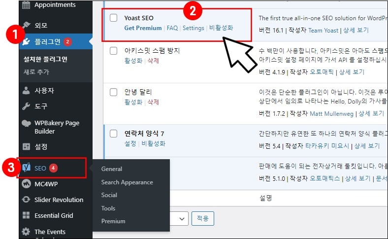 (1) 플러그인이 에서 (2) Yoast SEO [활성화]를 클릭하면 [비활성화]로 바뀌면서 (3) SEO 메뉴가 나타납니다.