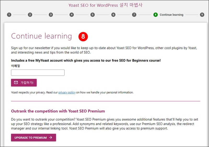 8단계 Continue Learning 은 Yoast 사로 부터 소식지를 구독할 수 있도록 이메일을 입력할 수 있습니다.