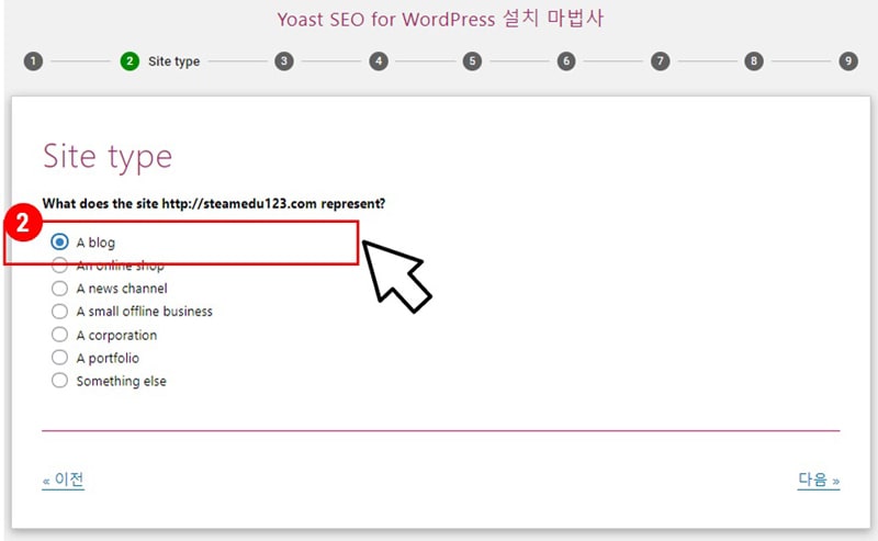 2단계 Site Type은 블로그, 온라인 쇼핑몰, 뉴스 채널, 소규모 업체, 기업, 포트폴리오, 기타 중에 원하는 사이트 유형을 선택할 수 있습니다. 일반적인 블로그라면 첫 번째를 선택합니다.