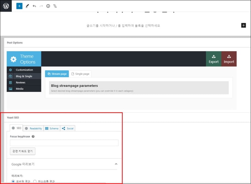 글쓰기에서 Yoast SEO의 내용을 볼 수 있습니다. Google 미리보기, SEO분석, +Add related keypharse, 코너 스톤 내용, 고급 메뉴가 있습니다.