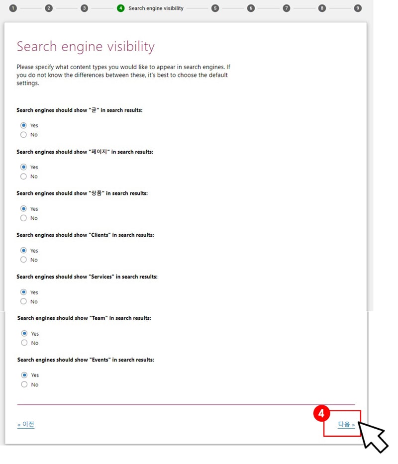 4단계 Search engine Visibility 은 글, 페이지 등이 검색 결과에 노출되도록 할지 설정할 수 있습니다. 보통은 기본 설정 "YES"를 그대로 유지합니다.