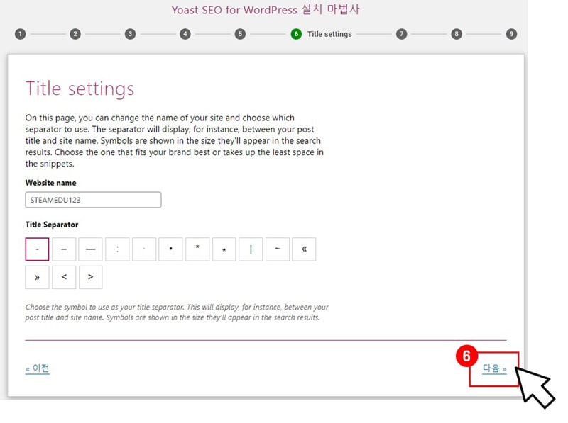 6단계 Title settings 에서는 사이트 이름과 포스 제목 사이에 추가되는 구분 기호(Title Separator)를 선택할 수 있습니다. 기본 설정을 유지하고 다음을 선택합니다.