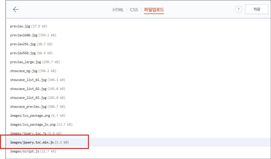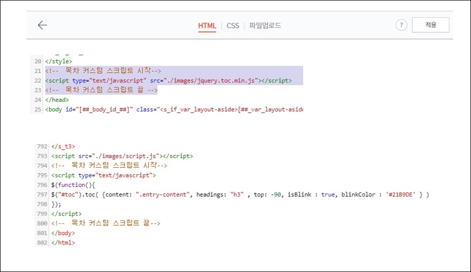 꾸미기 → 스킨 편집→ HTML을 선택합니다. 파일 업로드에서 jquery.toc.min.js 파일을 추가합니다.