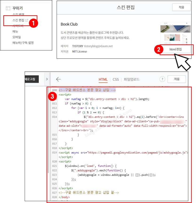 HTML 편집에서 Javascript 를 이용한 애드센스 광고 자동 삽입 (북클럽 스킨)