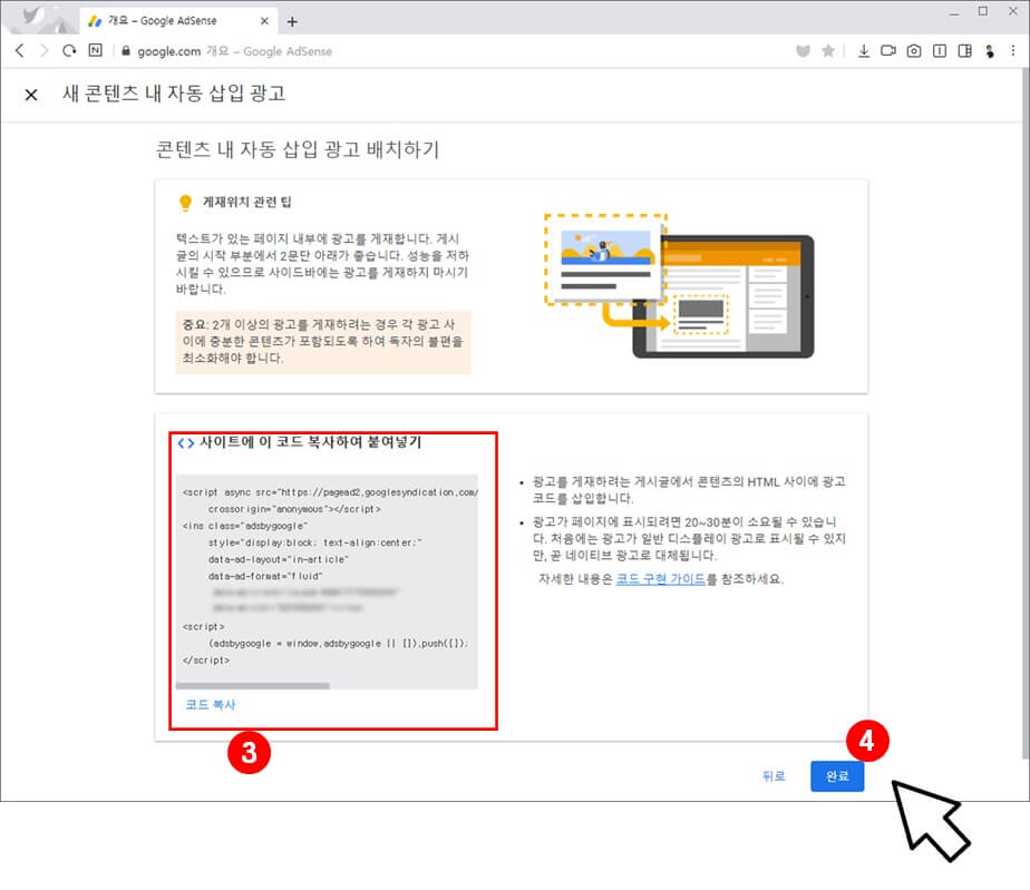 애드 센스에서 생성한 [콘텐츠 내 광고 삽입] 코드를 붙여 넣습니다. 완료 버튼을 클릭하여 서식을 저장합니다.