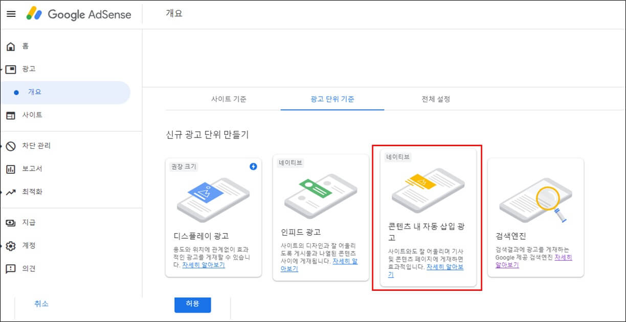디스플레이 광고, 인피드 광고, 콘텐츠 내 자동 삽입 광고 등의 신규 광고 단위 만들기 항목을 볼 수 있습니다.