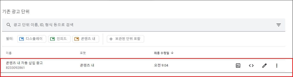 • 에드센스에서 '기존 광고 단위' 표에서 코드를 가져오려는 광고 단위를 찾습니다.