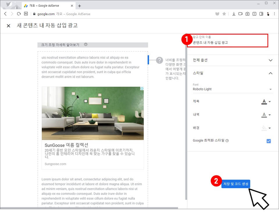 (1) 광고 단위 이름을 입력합니다. 원하는 이름을 입력하면 됩니다. 전체 옵션, 스타일, 제목, 내역, 배경 등을 원하는 값으로 설정할 수 있습니다. 일반적으로 기본 설정값을 사용합니다.
