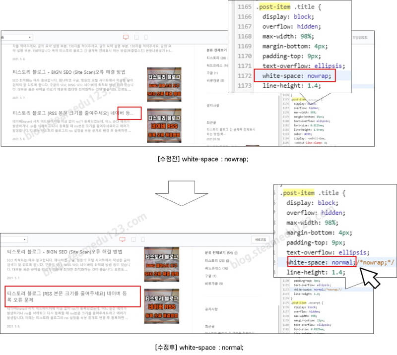 긴 글제목을 모두 표시합니다. 왜냐하면, 목록에서 제목이 긴 경우 (...)로 표시되어 제목이 잘리는 문제가 발생합니다. 예를 들어 nowrap을 normal로 변경하면 (...) 됩니다. 따라서 블로그의 가독성을 높이기 위해 nowrap 속성을 css에서 변경합니다.