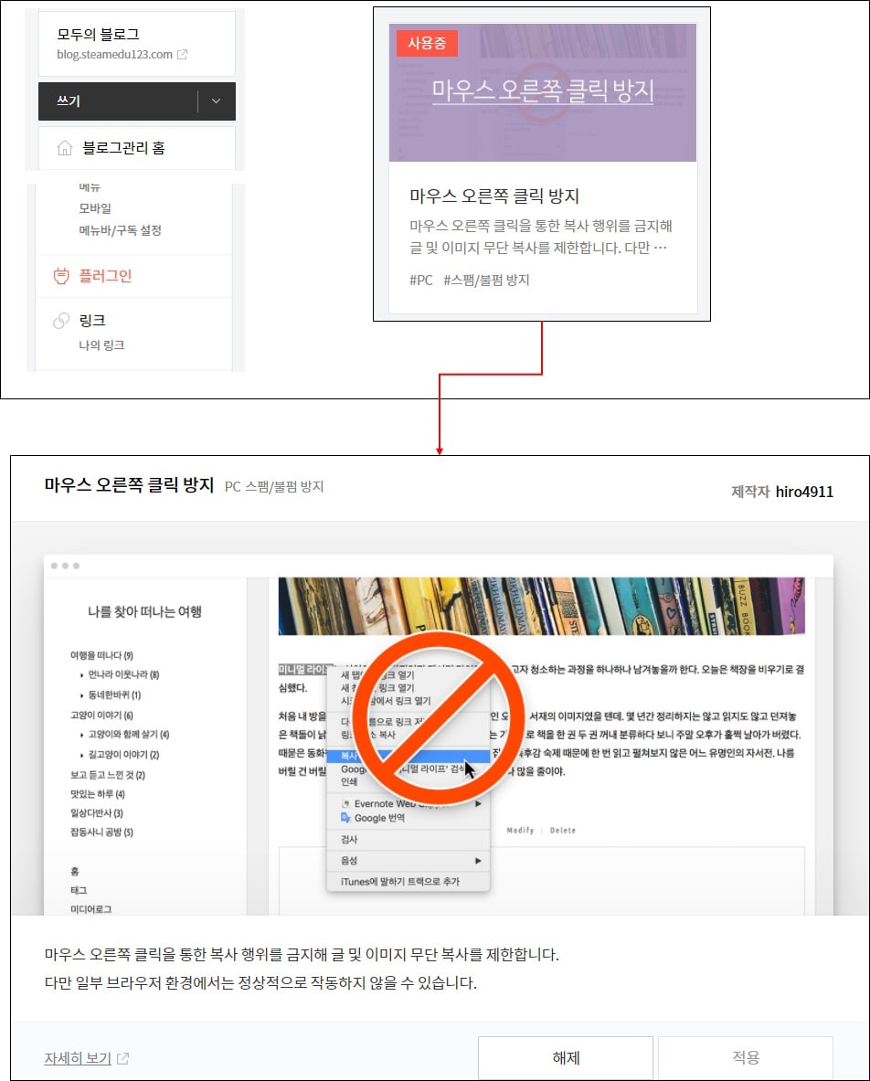 티스토리에서는 우클릭 방지 플러그인을 제공합니다. 하지만 북클럽 스킨에서는 [마우스 오른쪽 클릭 방지] 스킨만으로 기능이 정상적으로 동작하지 않습니다.
