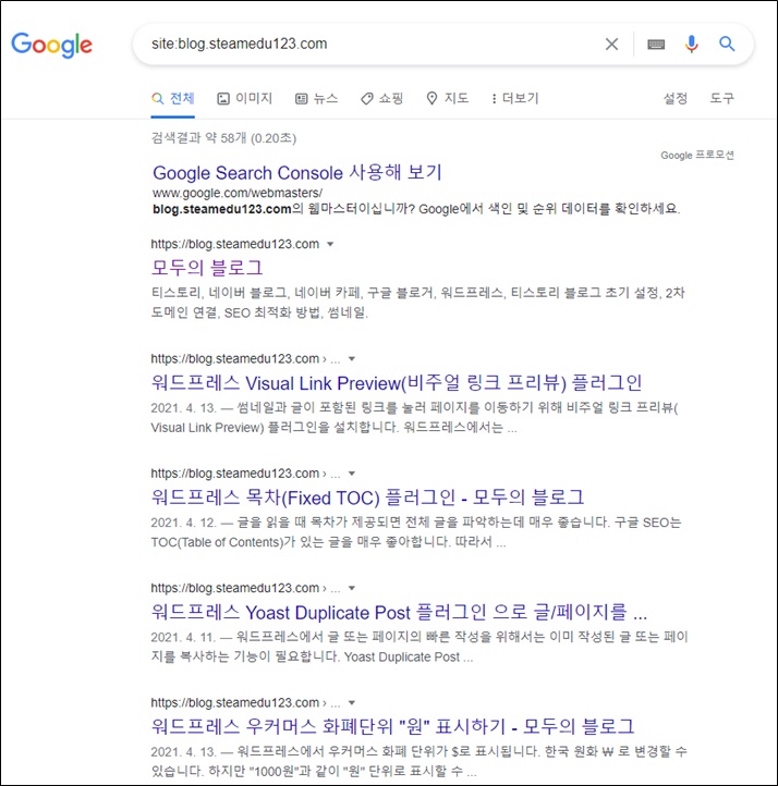 구글에서 site:(본인의 블로그 주소) 를 입력하고 검색 버튼을 클릭하고 정상적으로 포스트가 나오는지 확인합니다.