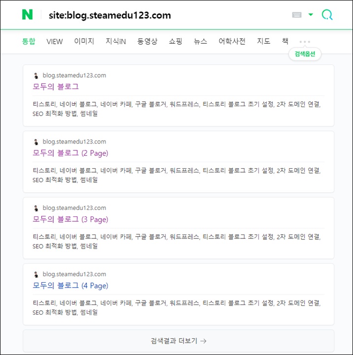 다음에서 site:(본인의 블로그 주소)를 입력하고 검색 버튼을 클릭하고 정상적으로 포스트가 나오는지 확인합니다.