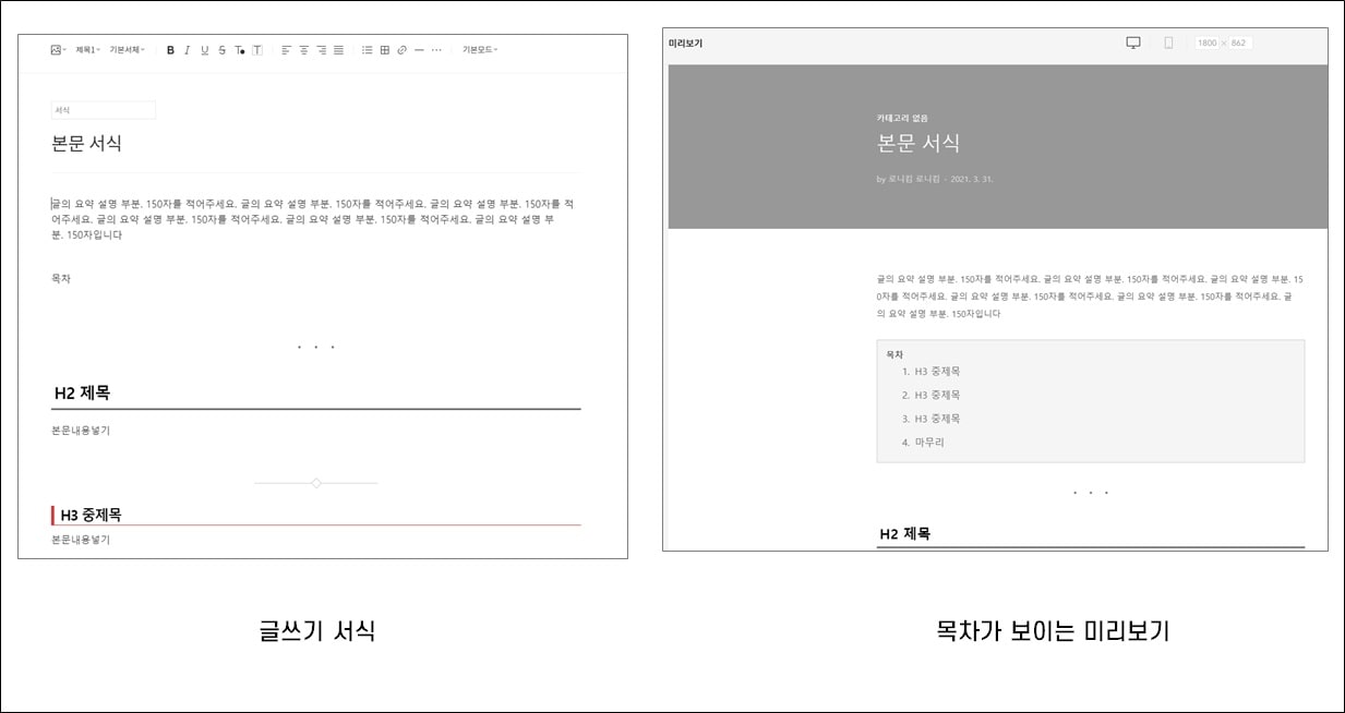 H2, H3를 사용하였으며, 목차(TOC)가 포함됩니다. 목차는 H3를 표시합니다.